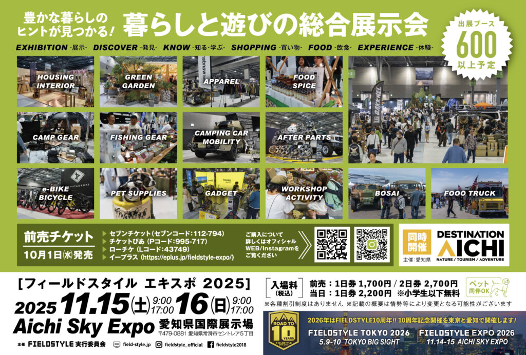 11月15日(土)~16日(日)愛知県国際展示場で開催される、暮らしと遊びの総合展示会「FIELD STYLE EXPO 2025」に出店します。